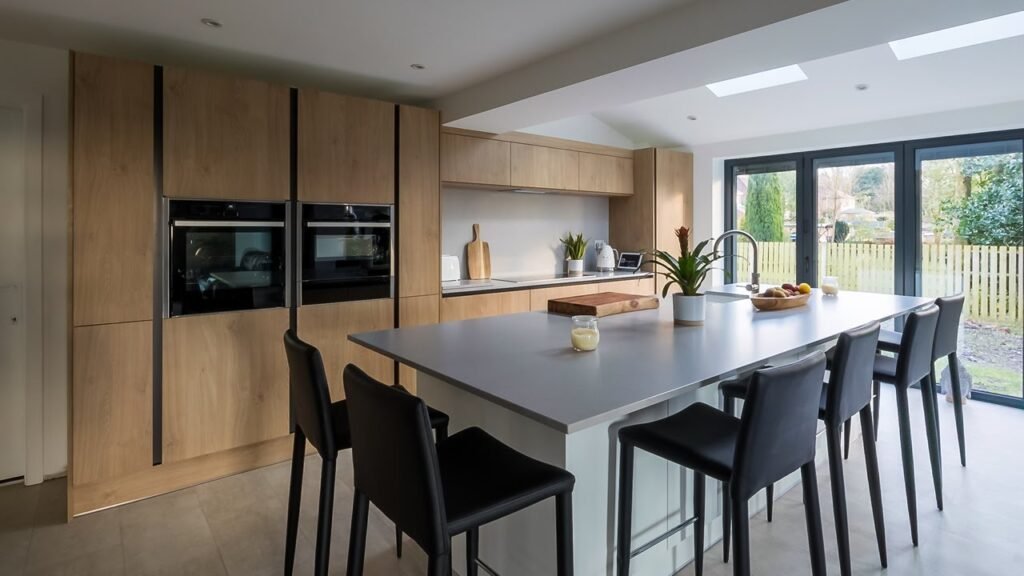 You can go for modern German-style handleless cabinets or simple matt doors that feel calm and clean.